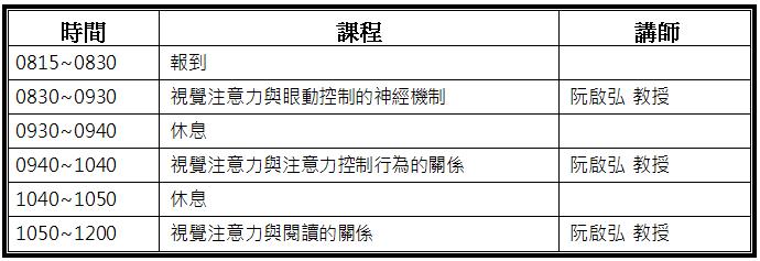 探討閱讀歷程時,視覺功能和眼球動作是重要的元素。本次課程將會從視覺認知的神經機制為基礎,延伸到眼球運動、注意力、視覺短期記憶、衝動控制等執行功能的介紹,藉由實證科學瞭解視覺注意力與眼球運動的關係,進而延伸至眼球動作和中文閱讀技巧的關係。課程內容能幫助臨床工作者了解眼動控制與視覺注意力的神經機制,並釐清兩者與兒童閱讀表現的關係,藉此提供臨床工作者在介入兒童閱讀功能時,能有清楚的臨床推理和思考脈絡,以提升臨床活動介入的效益。