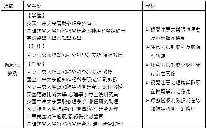 社團法人臺灣應用復健協會特別規畫並邀請國立中央大學認知神經科學研究所阮啟弘教授與學員作一個完整分享,課程名額有限額滿為止,有興趣的朋友把握這難得的學習機會。