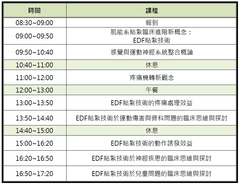 大家認識各種疼痛來源之傳導形式,探討肌能系 貼紮技術如何影響組織修復的過程,以及思考如何將肌能系 貼紮技術運用在疼痛及腫脹、中樞及週邊神經疾患的個案。課堂中亦有實作練習機會,範例涵括了皮膚的三個層次:表皮、真皮及筋膜,一步步讓學員們吸收全新的 概念,並進一步熟習、運用 貼紮技術,讓您原有的貼紮實力更加完備!
