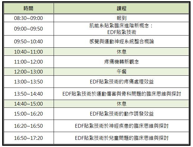 痛來源之傳導形式,探討肌能系 貼紮技術如何影響組織修復的過程,以及思考如何將肌能系 貼紮技術運用在疼痛及腫脹、中樞及週邊神經疾患的個案。課堂中亦有實作練習機會,範例涵括了皮膚的三個層次:表皮、真皮及筋膜,一步步讓學員們吸收全新的 概念,並進一步熟習、運用 貼紮技術,讓您原有的貼紮實力更加完備!