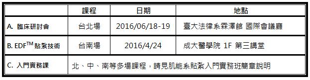 肌能系貼紮技術臨床研討會- 講授貼紮技術的力學觀念、操作技巧與進階思考邏輯運用,並進行臨床運用之示範指導,讓大家對於貼紮概念有完整深入的認識和瞭解,提升臨床判斷的實力,成為具有實務貼紮能力的專業執行者。