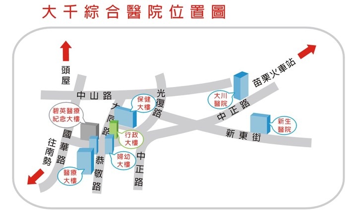 苗栗大千綜合醫院 碧英大樓 地址:苗栗市信義街36號 交通方式:http://www.dachien.com.tw/traffic.php
