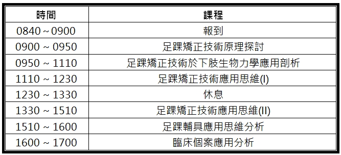 本課程由臨床觀點切入,探討必要且實用的相關足踝解剖理論,系統性的講解評估量測技巧,並由實務觀點說明量測出數據所代表之臨床意義;實例分析各種個案狀況之處置方式,逐步引領學員具體建立清楚的足踝矯正介入之邏輯思維。課程著重實際操作,完整教材包含ICB鞋墊三雙、墊片、量角器、及熱烘槍,使學員能精實強化本職學能,提升自身的專業價值與競爭力!