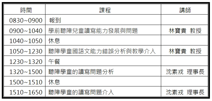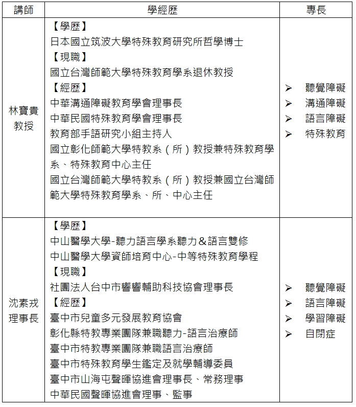 林寶貴教授曾任中華溝通障礙教育學會理事長,投入於特殊教育領域中『溝通障礙』的研究數十年不遺餘力,教授將以豐富的教學經驗和學術研究知識,講授聽障兒童於學前的讀寫能力發展與問題,以及聽障學童國語文能力的錯誤分析與教學介入。