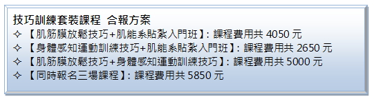『身體感知運動訓練技巧』課程,運用感覺整合、動作學習與體適能的理論及介入原則,針對不同族群來設計一套訓練計畫,課程中會實際練習器材操作並教導如何藉由器材提供的感覺回饋,來引導學習者更清楚感知身體的動作與狀態!