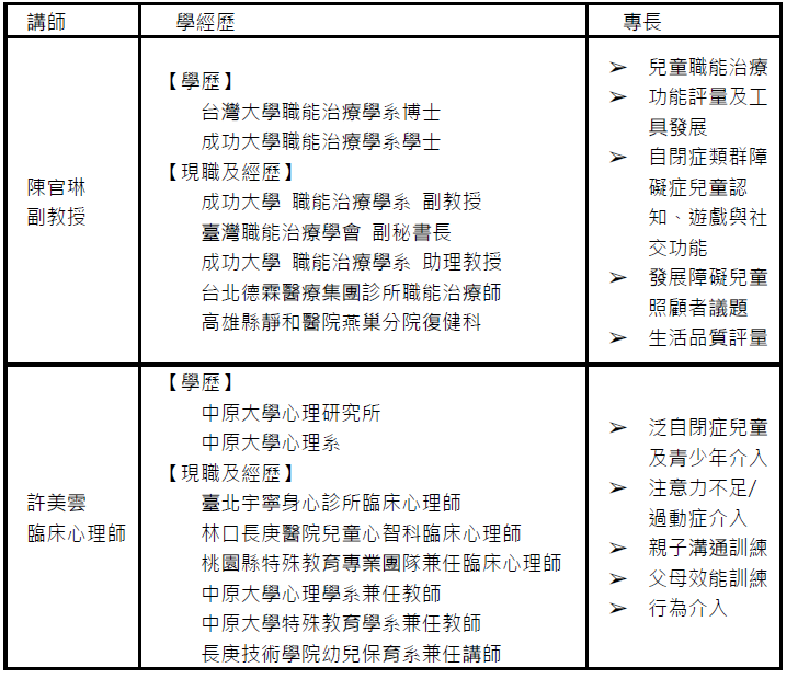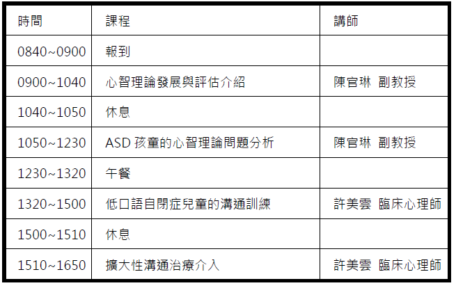 此外,我們也邀請具有豐富臨床治療經驗的許美雲臨床心理師,將與學員分享以自閉症個案為中心的「擴大性溝通治療 (Expanding Communication Therapy for people with ASD, ECTA)」,此治療模式在於促進個案溝通表達與人際適應為目標,視發展階段選擇適合個案的溝通方式,協助自閉症個案及其互動者,養成溝通的習慣,並促進良性的溝通與互動關係。期待本課程能提供對於自閉症相關的服務人員或是互動者能有所助益。